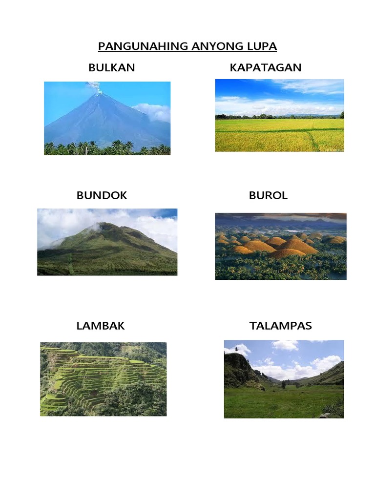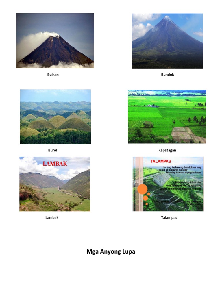 Bundok Bulkan Burol Lambak Talampas Kapatagan Tangway at Tangos. Mayroong dalawang uri ang bulkan eto ay ang aktibo at ndi aktibo. LAMBAK Ang lambak ay isang mababang lugar sa pagitan ng mga burol karaniwan na may ilog na dumadaloy dito.