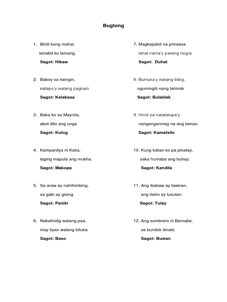 May likod walang tiyan matulin sa karagatan. Free bogtong bogtong ang sombrero ni bernabe sa bundok itinabi. Be notified when an answer is posted.